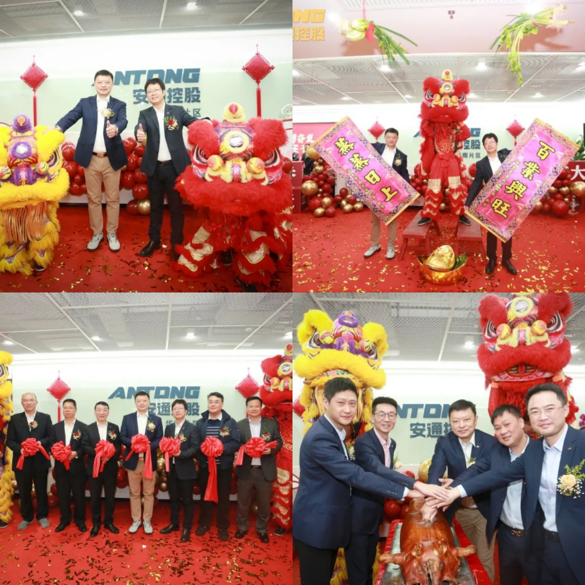广州港集团副总经理宋小明和中国外运副总经理兼外运华南总经理汪剑作为嘉宾代表上台为安通控股华南片区乔迁送上祝福。金剪齐开,旗开得胜。伴随着掌声与欢呼声,剪彩仪式拉开序幕。楼建强总裁与嘉宾们一起手执鸿运金剪,为安通控股华南片区剪开一条蓬勃发展之路,以乔迁之喜,启航远大新征程。仪式上,董事总裁楼建强与财务总监艾晓锋、副总裁兼航运中心总经理郭朝阳、董事长助理兼行政部总经理魏澄宇、华南片区总经理杨勇共同切金猪,寓意未来发展一切顺利,齐心远航,共同筑梦。楼建强与宋小明一同为象征着吉祥好运的醒狮点睛,寓意安通控股华南片区必将如雄狮般气势如虹,蒸蒸日上。被唤醒的雄狮为大家带来了精彩的采青表演。鼓声节拍强劲有力,雄狮时而跳跃,时而劲走,赢得满堂彩。